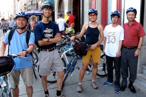 After lunch, my cousins Fuman, Peter, Gabriel AND my dad all rented bikes and we took a ride around town! Dad started out really well — it has been over 30 years since he’s been on a bike. He even asked for rubber bands to tie up his pant cuffs like an old pro. Then he crashed twice — once going uphill and then again on gravel. After picking himself up and pedaling on resolutely, a thundershower hit us, with high heavy winds, as we crossed a busy bridge over the St. Lawrence River back to Old Port. Dad stopped on the bridge and, shaken and soaked, pulled out an umbrella. We made it back another half-mile, returned our bikes, and I bought him a hot tea. I might be able to get him on a bike again. Perhaps in our next lifetimes?