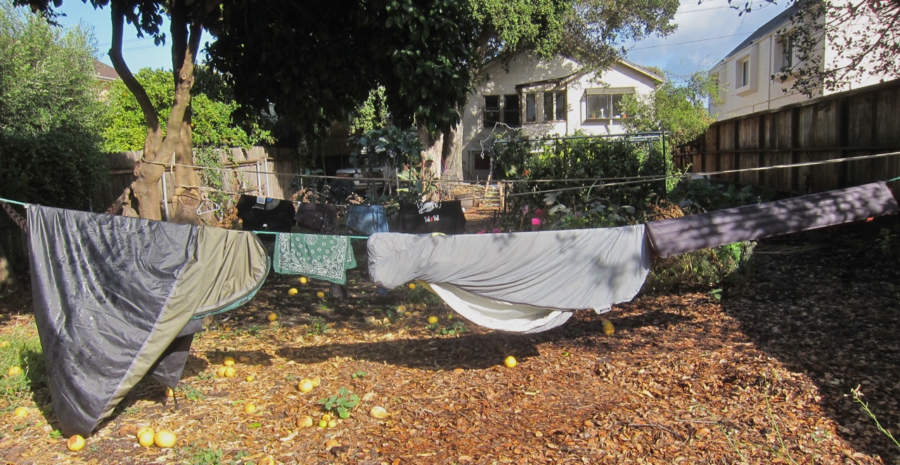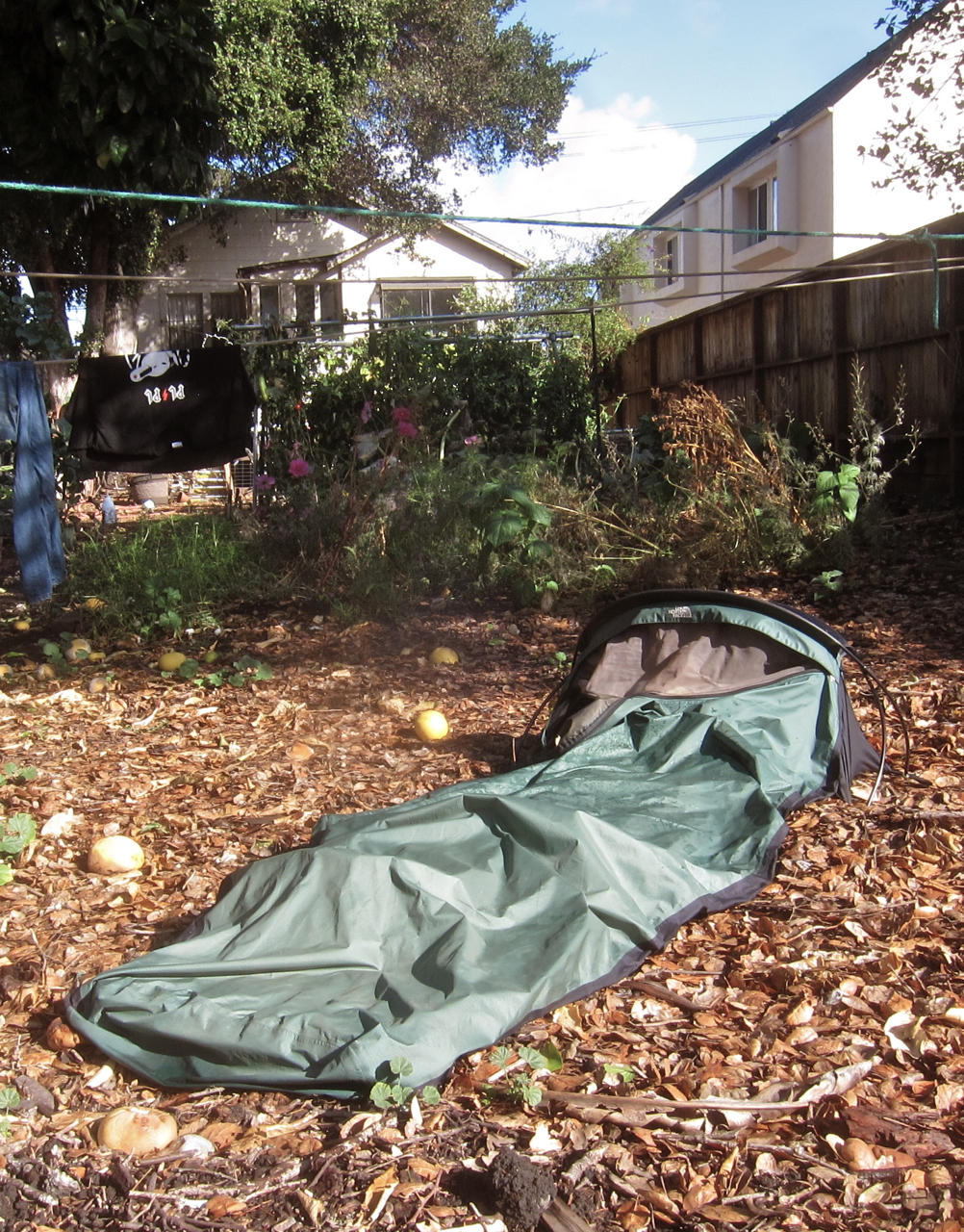 I woke up again at first light, hungry (as usual), but climbed back in after finding I was locked out of the house. A little later, I unzipped the bivy into a brilliant bright blue North Oakland morning — still a bit damp, but warm and lively-like.