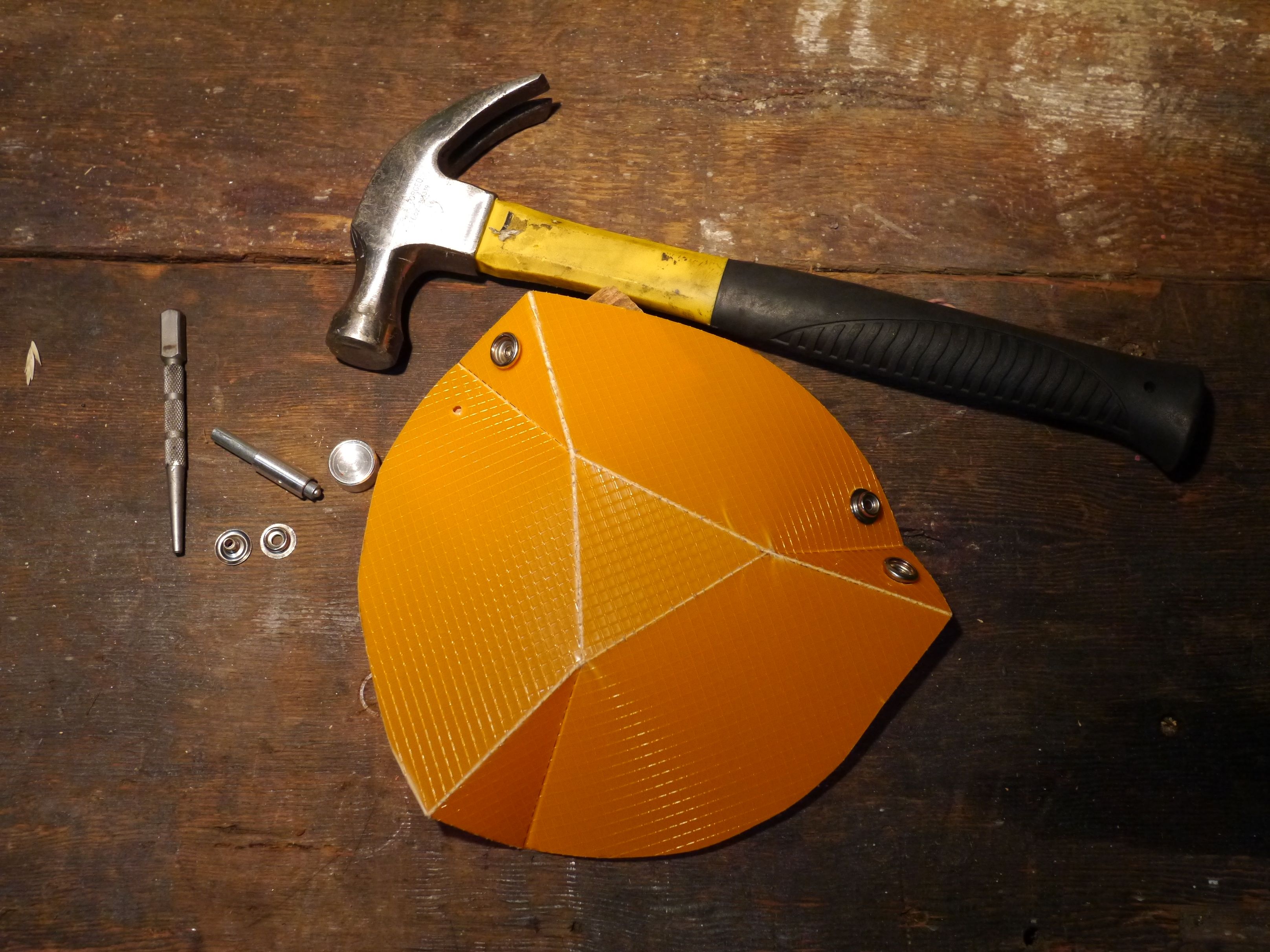 “Oh yea?” I sneer and cut off the little tabs. I stomp down to the workshop for a hammer and brass snaps. Pound, pound, POUND — and dang! I pounded the wrong pieces together.