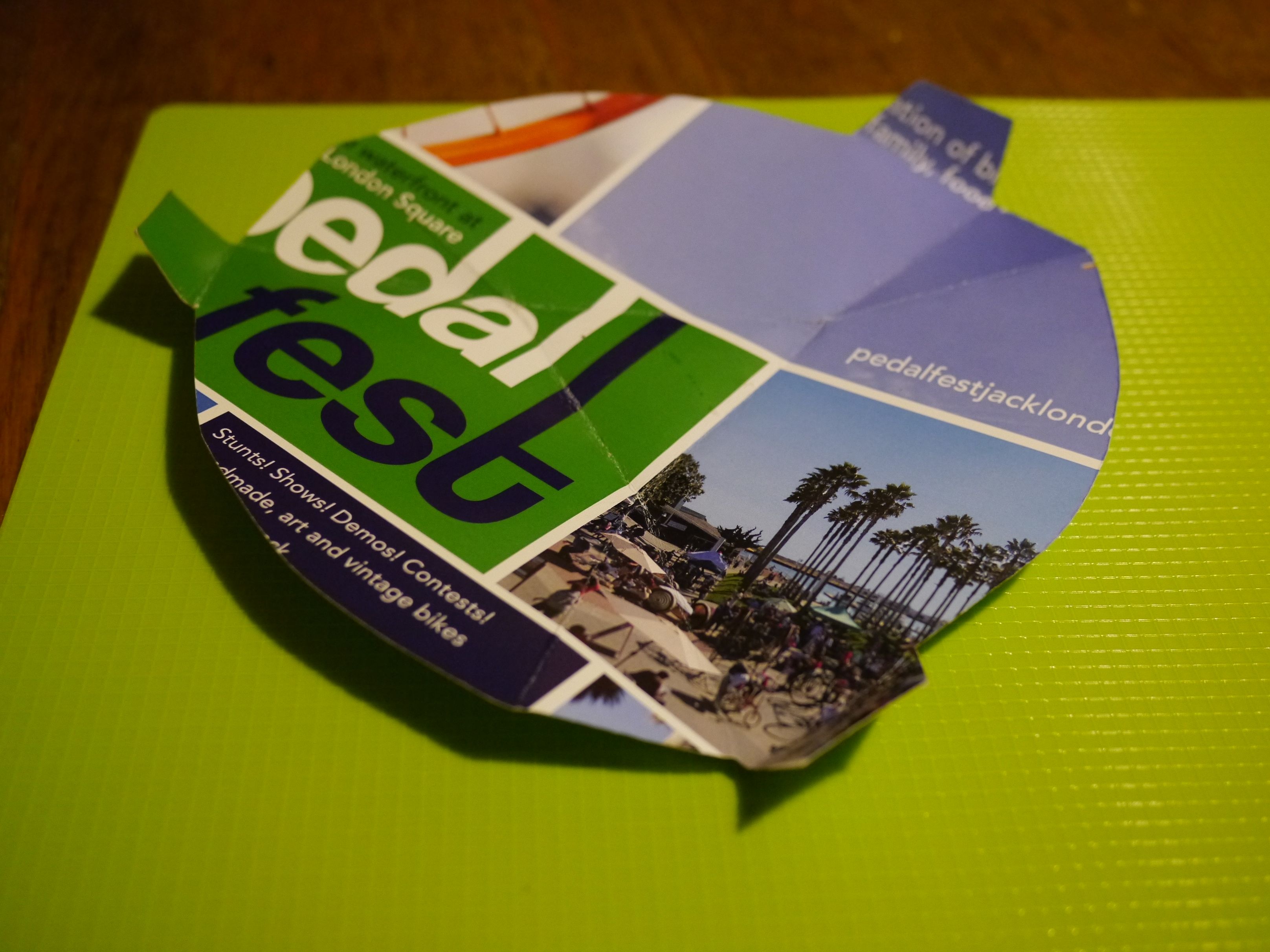 “Ai ya!” I break out the power tools — oops, put on some safety glasses — to drill out the offending button. Pound, pound, pound again and finally! I’ve made the world’s most over-built origami camp bowl. The brass snaps double the weight and unfolded, they jingle like a tambourine.