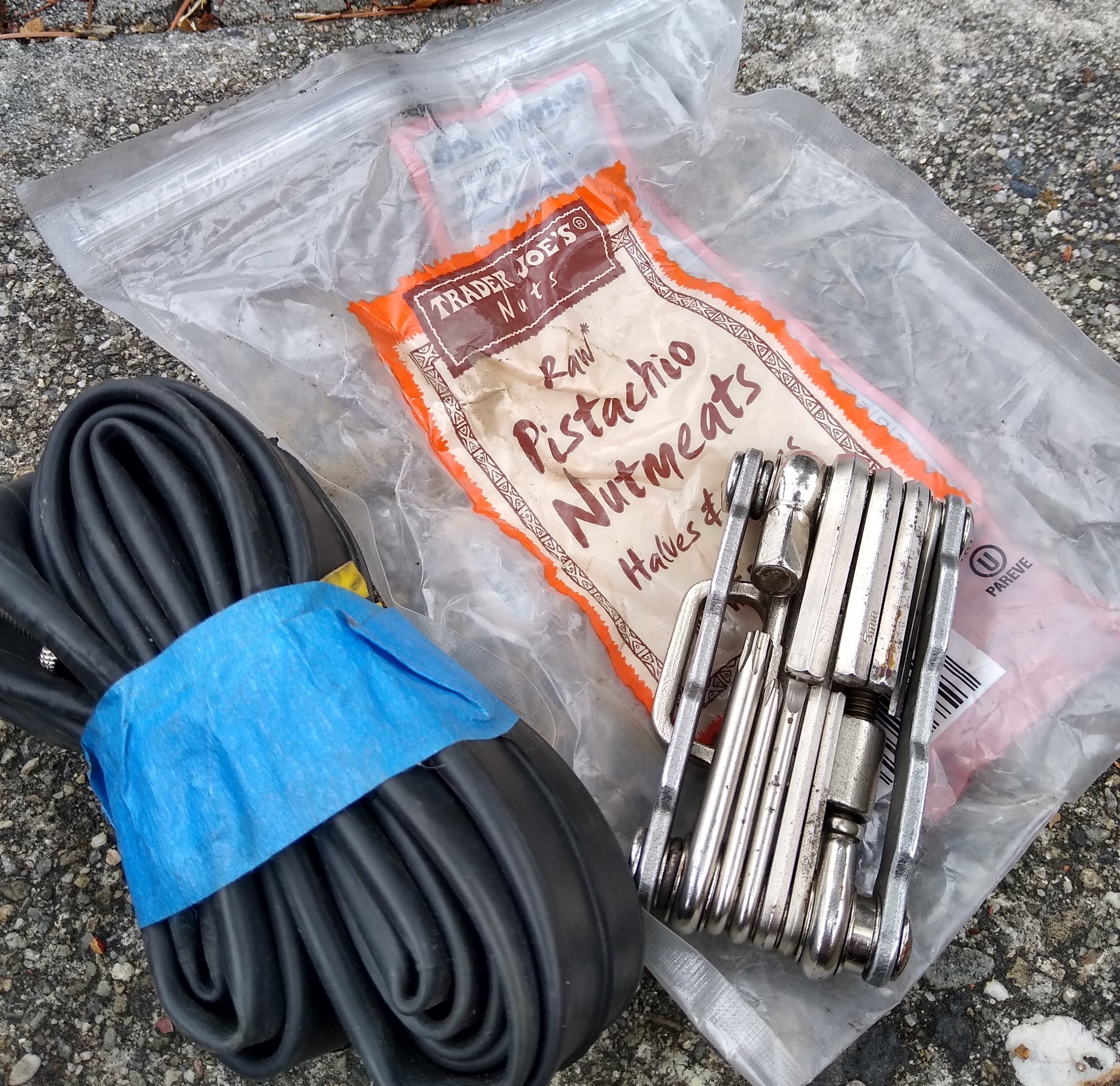 That’s when I noticed the beefy ziploc bag carrying my spare tube. Specifically, an ex-bag of pistachio nutmeats from Trader Joe’s. Hopefully, I folded up the bag and placed it over the slash. I pumped up the tire and held my breath.