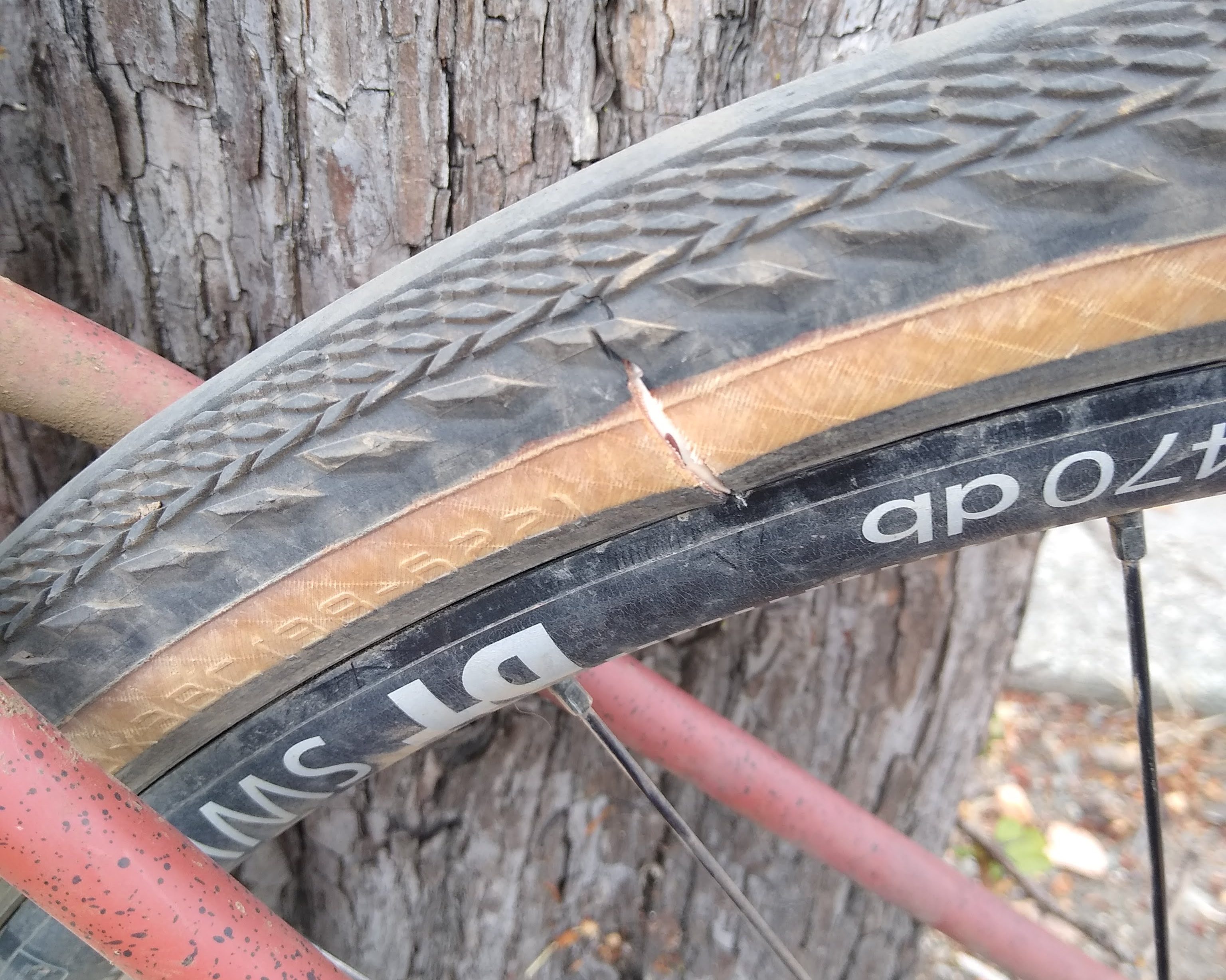 Disaster! It wasn’t just a pinch flat. My tire was sliced a third of the way around. And I had just 30 minutes before staff meeting at work.